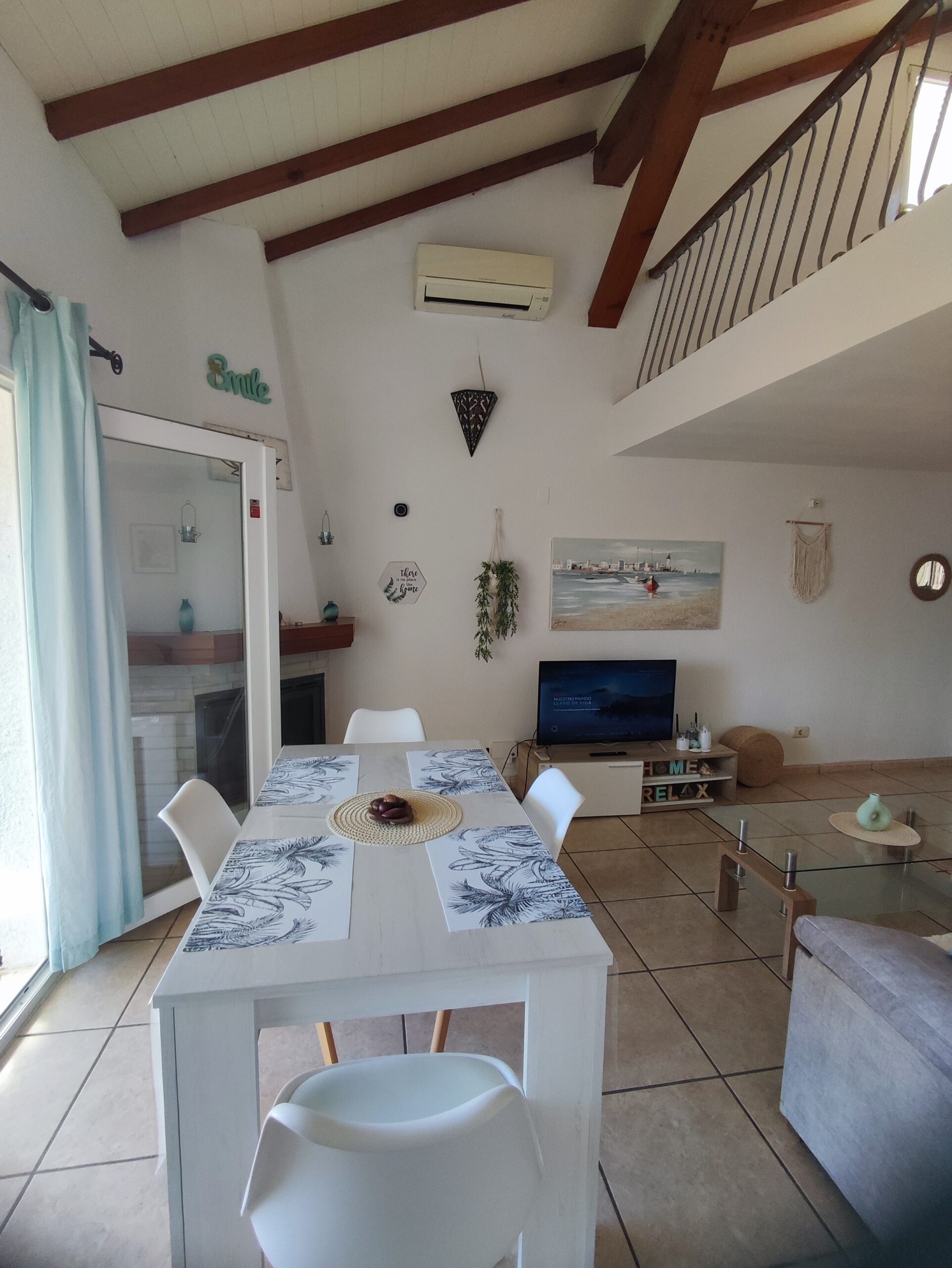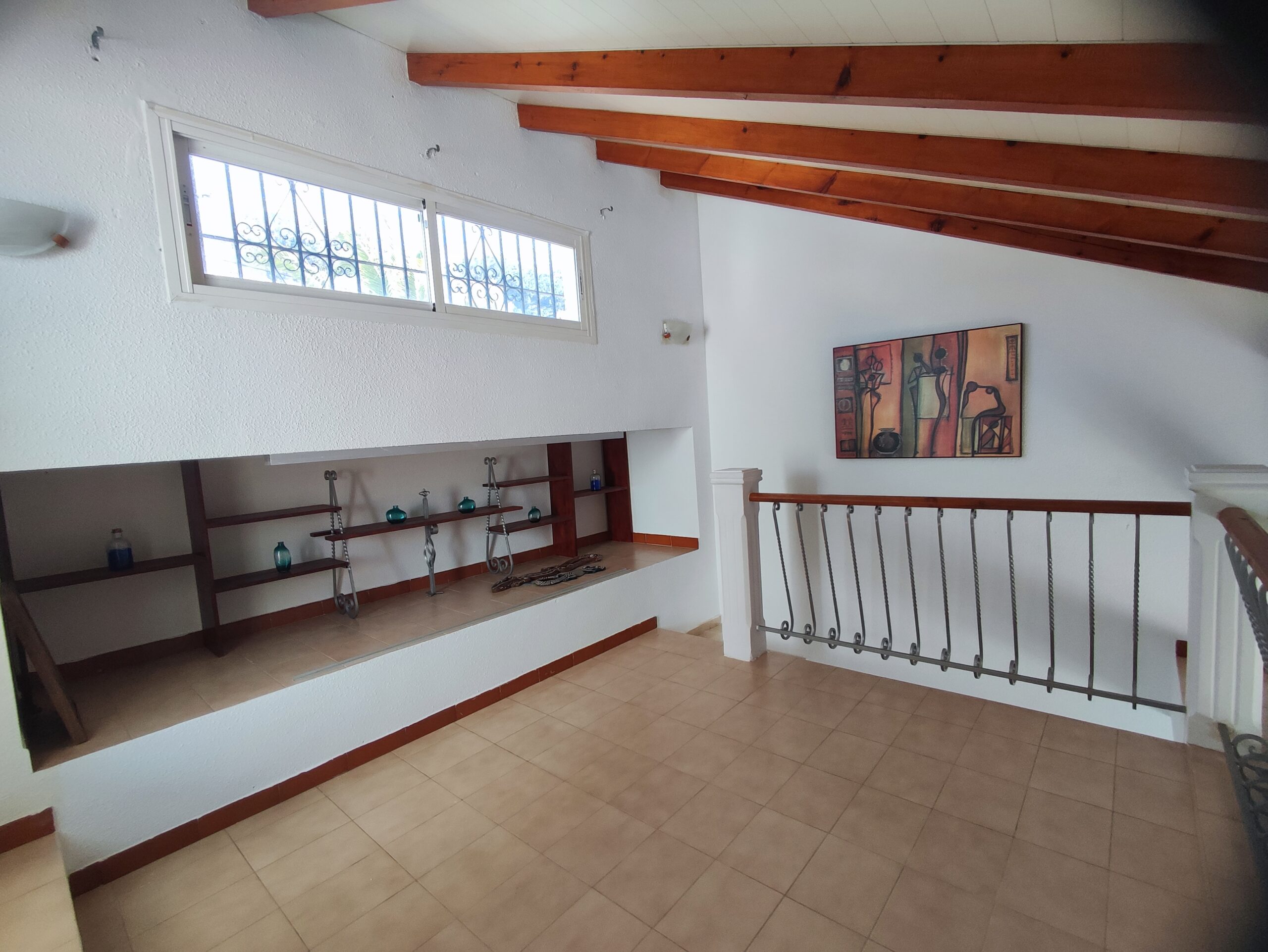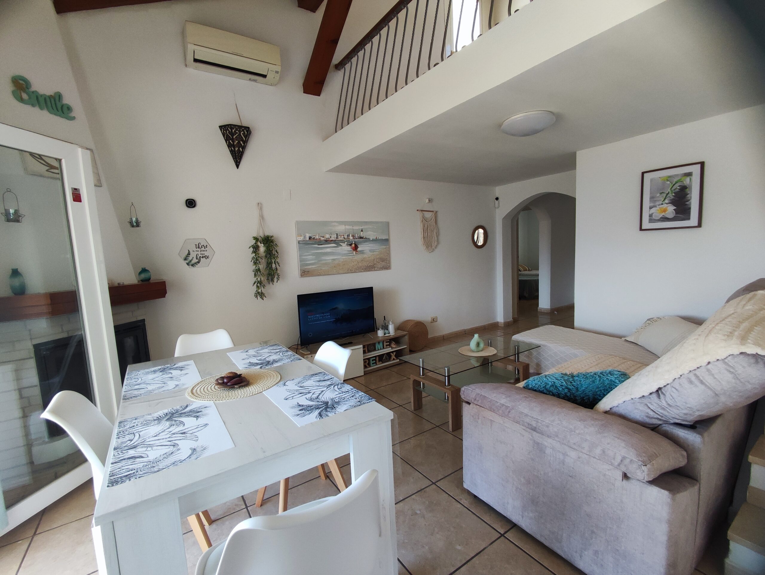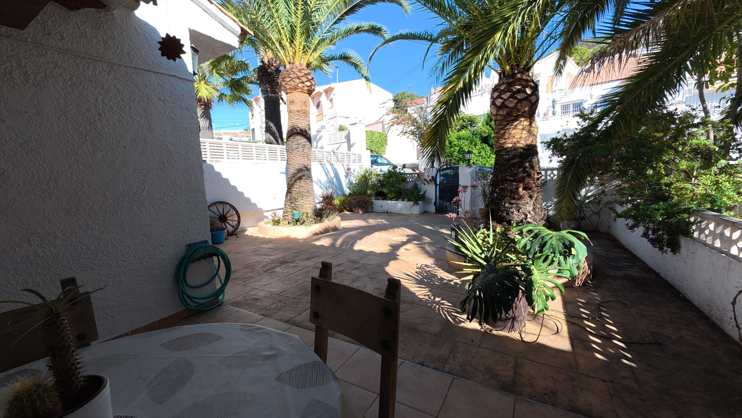 The main residence welcomes you with a spacious north-facing terrace framed by palm trees – perfect for relaxing in a green setting. Inside, the bright living room features high ceilings and a cozy fireplace, creating a warm and airy atmosphere. The layout includes two bedrooms, a bathroom, a guest toilet, and a versatile upper floor that can serve as an office or additional bedroom. From here, step onto a private balcony and enjoy beautiful open views. There is also a smaller room ideal as storage or an extra sleeping space.