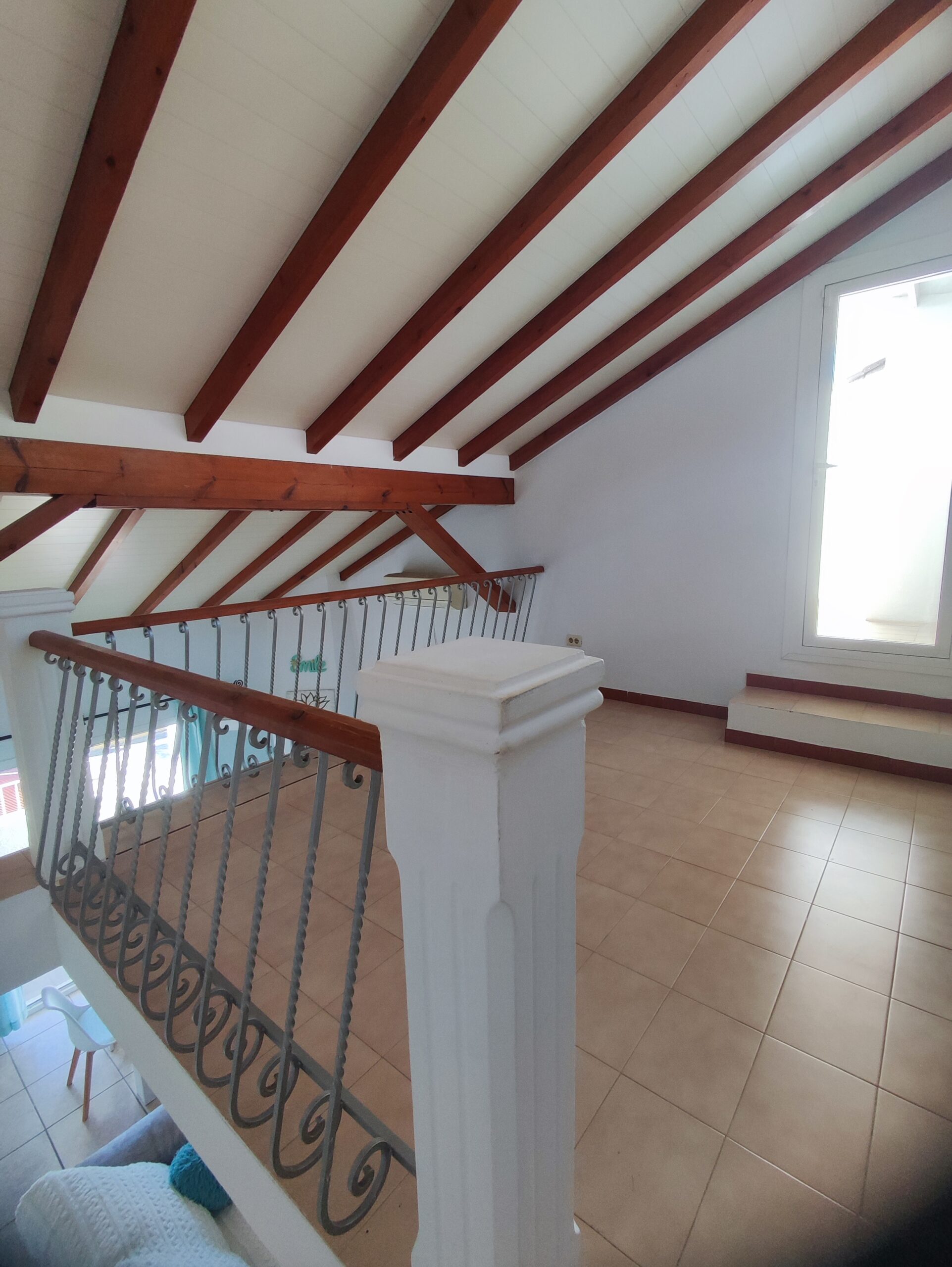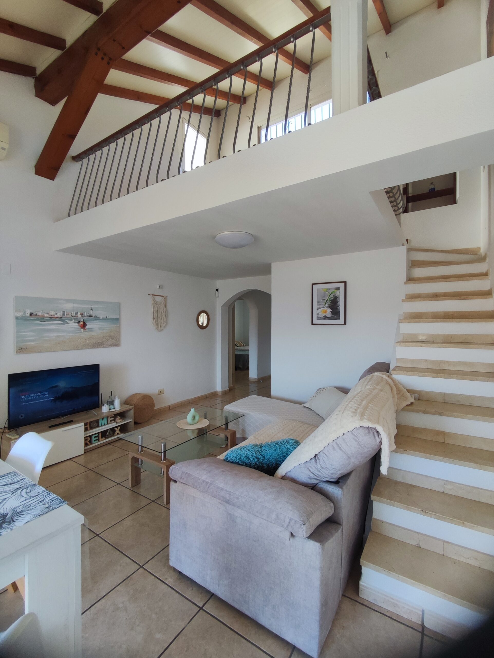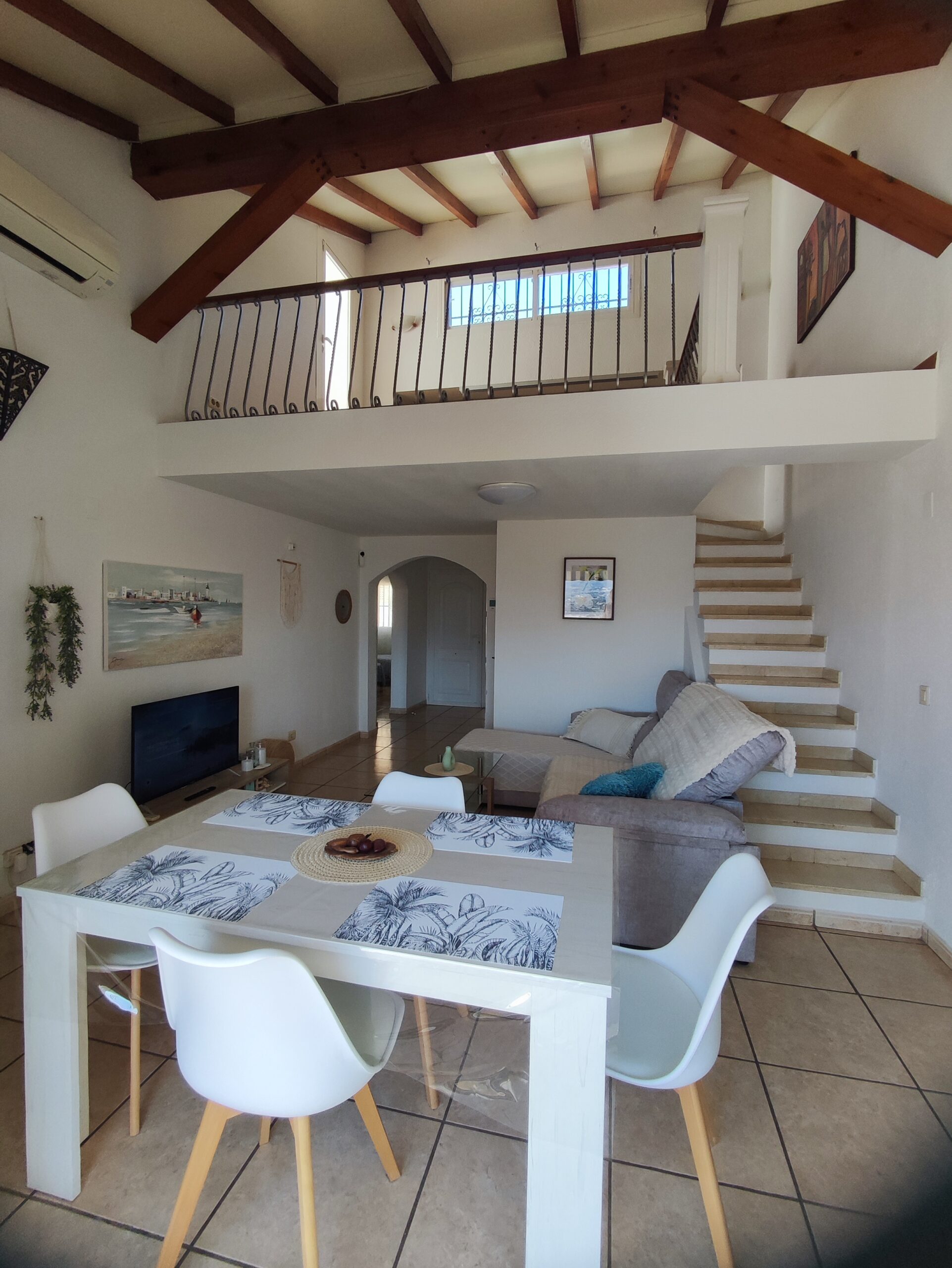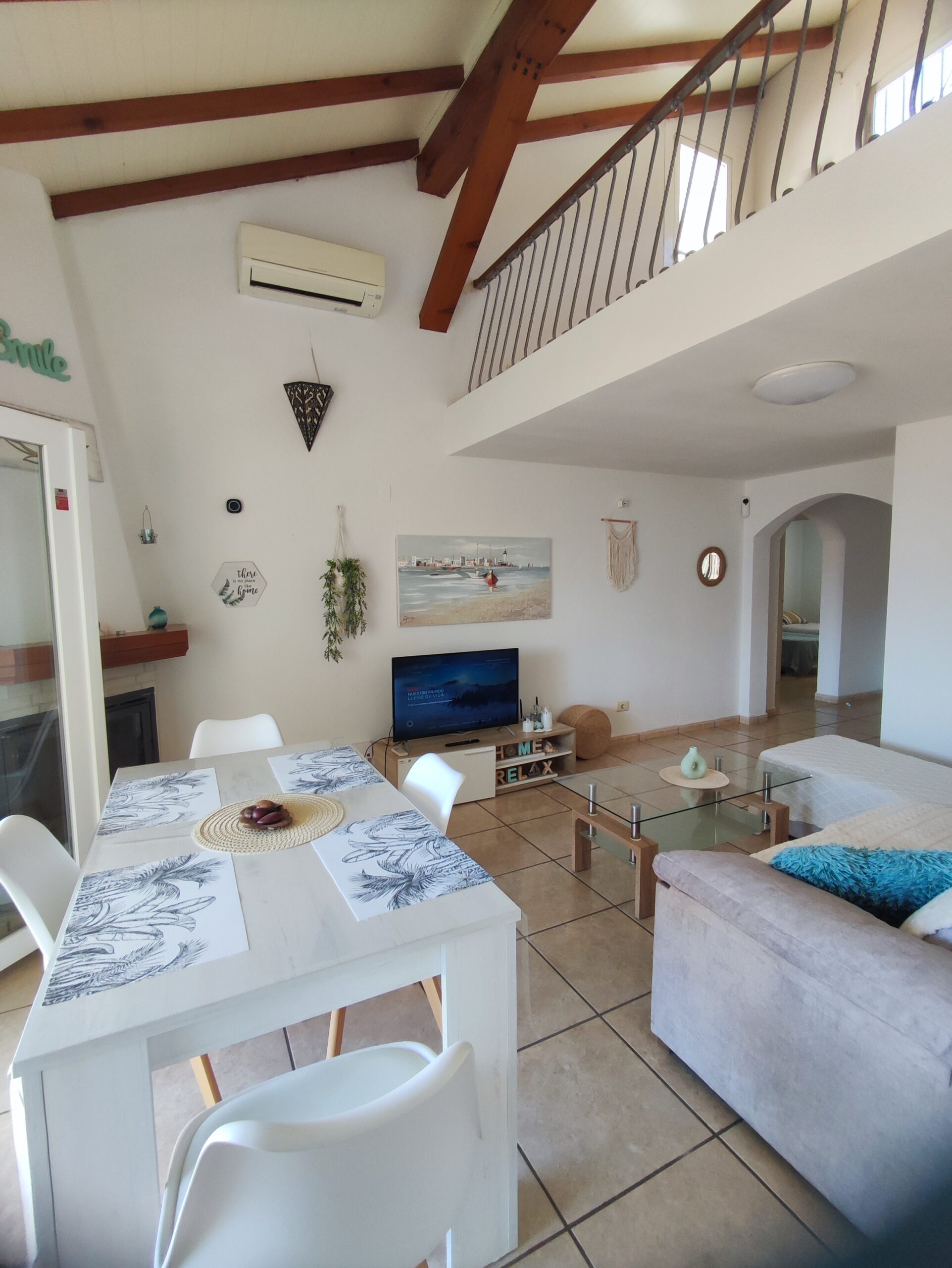 The main residence welcomes you with a spacious north-facing terrace framed by palm trees – perfect for relaxing in a green setting. Inside, the bright living room features high ceilings and a cozy fireplace, creating a warm and airy atmosphere. The layout includes two bedrooms, a bathroom, a guest toilet, and a versatile upper floor that can serve as an office or additional bedroom. From here, step onto a private balcony and enjoy beautiful open views. There is also a smaller room ideal as storage or an extra sleeping space.