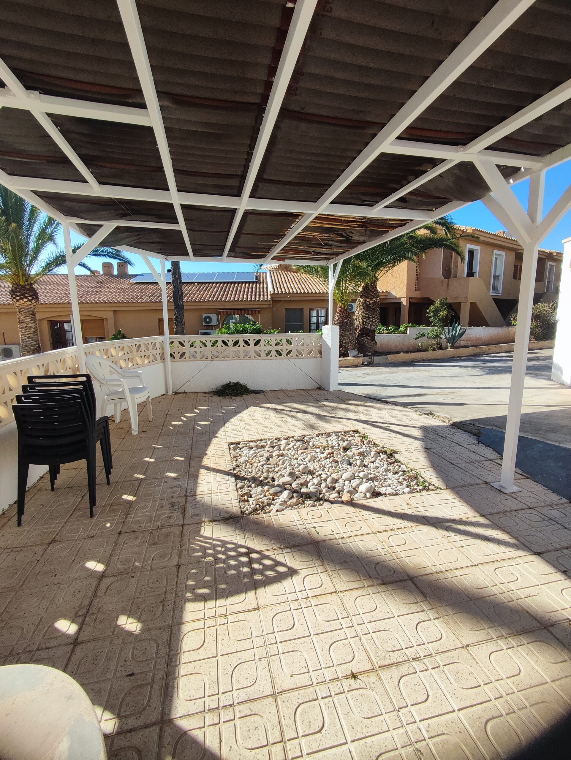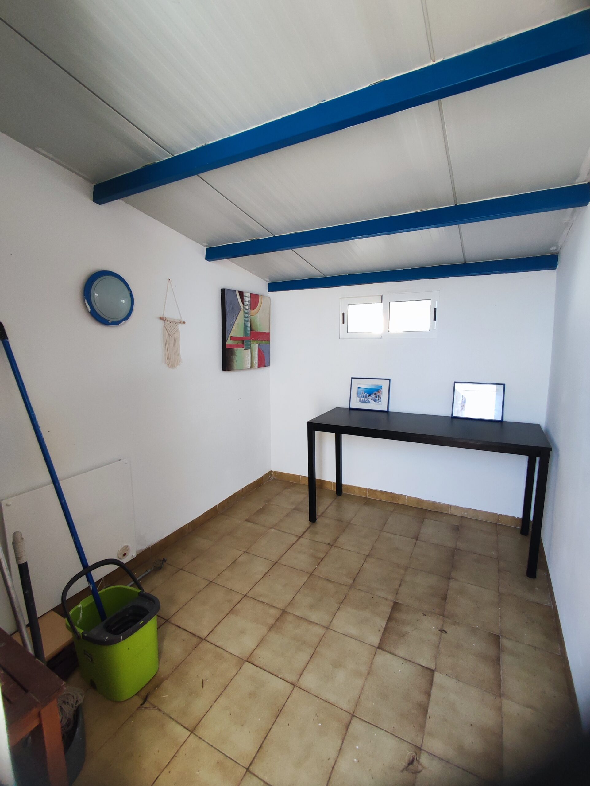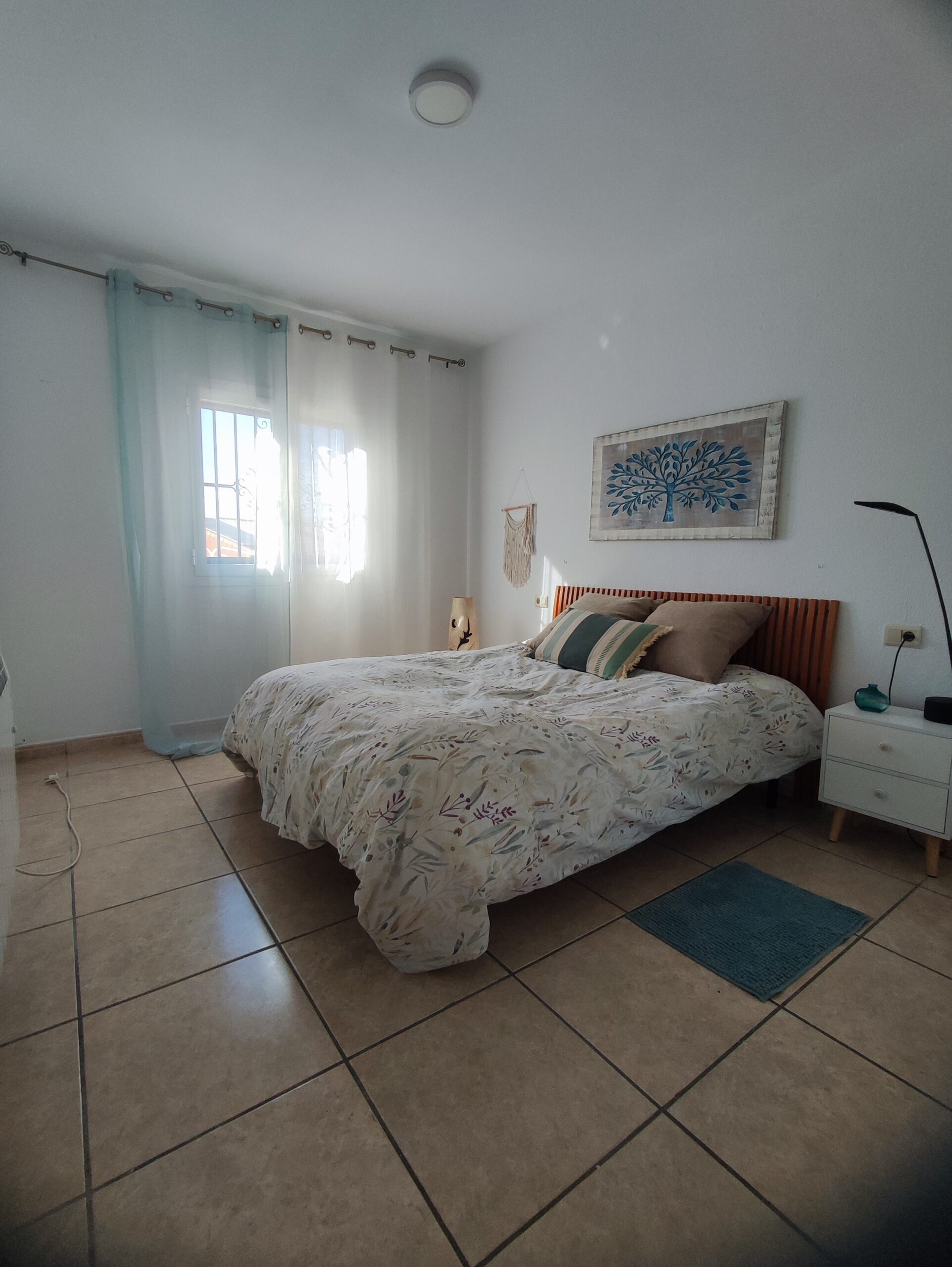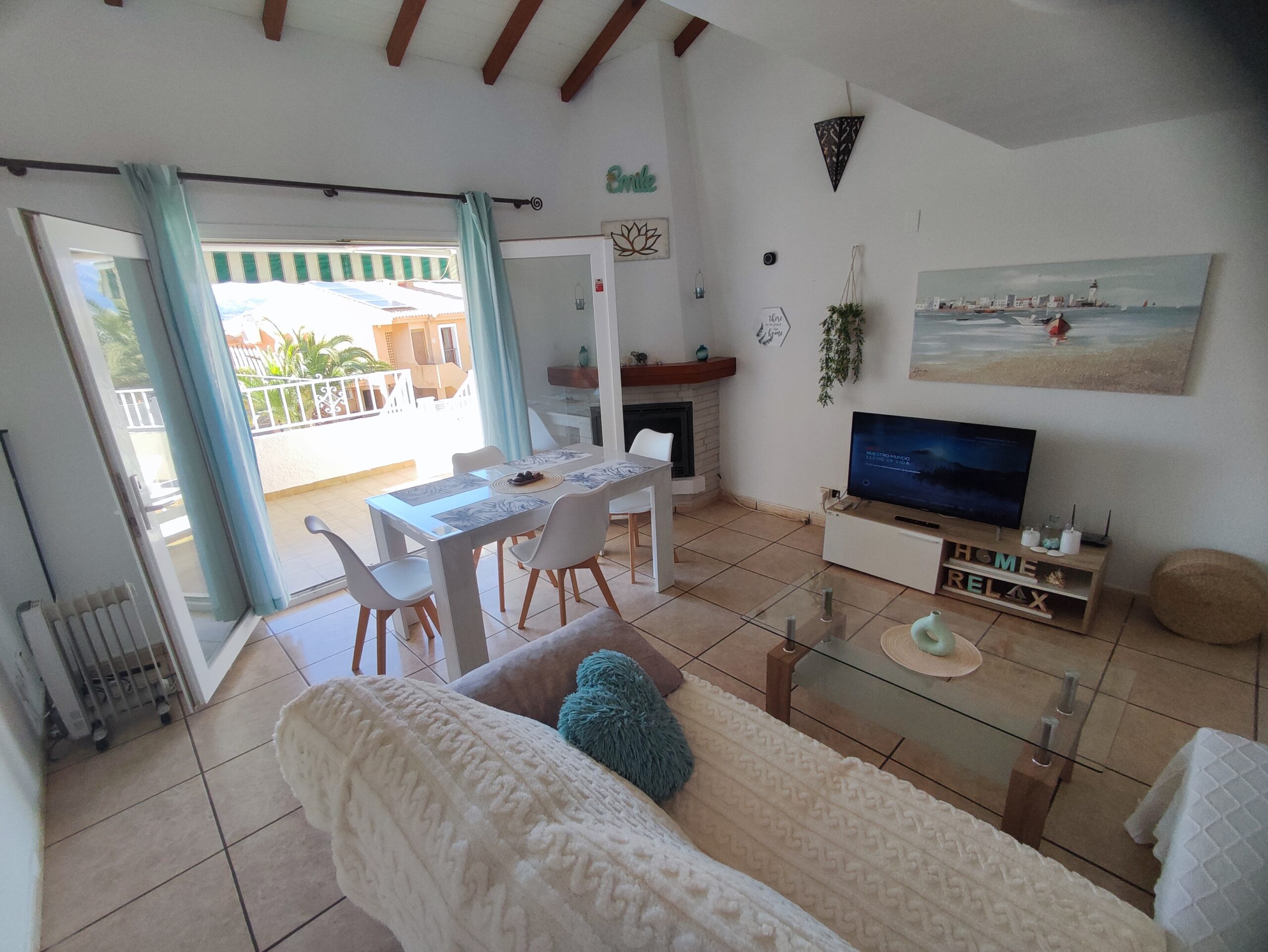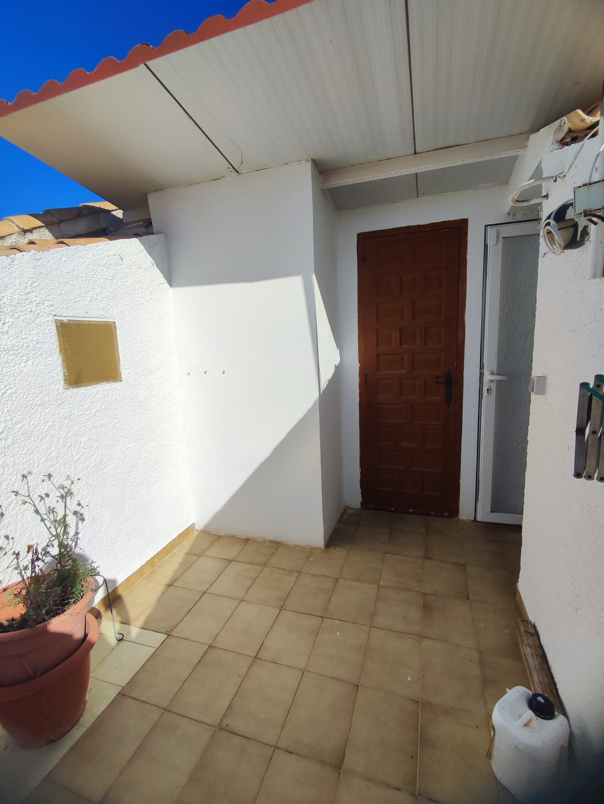 The main residence welcomes you with a spacious north-facing terrace framed by palm trees – perfect for relaxing in a green setting. Inside, the bright living room features high ceilings and a cozy fireplace, creating a warm and airy atmosphere. The layout includes two bedrooms, a bathroom, a guest toilet, and a versatile upper floor that can serve as an office or additional bedroom. From here, step onto a private balcony and enjoy beautiful open views. There is also a smaller room ideal as storage or an extra sleeping space.