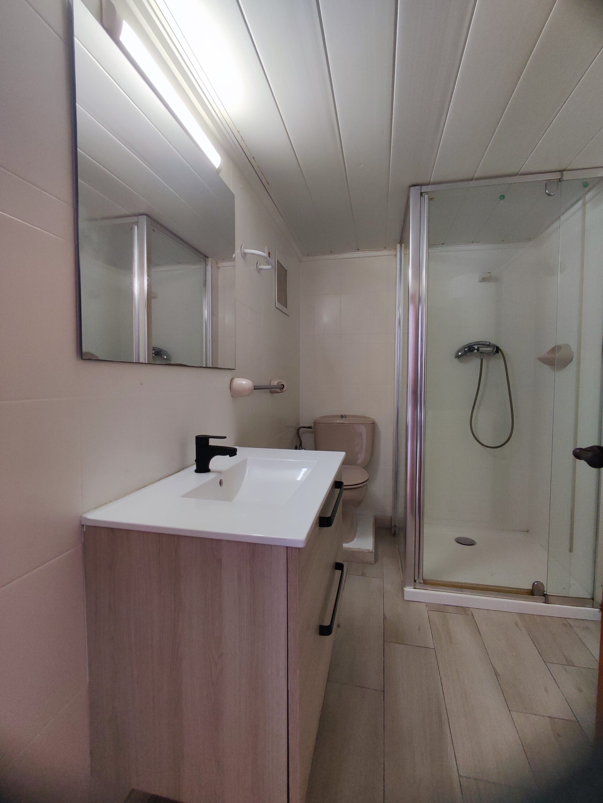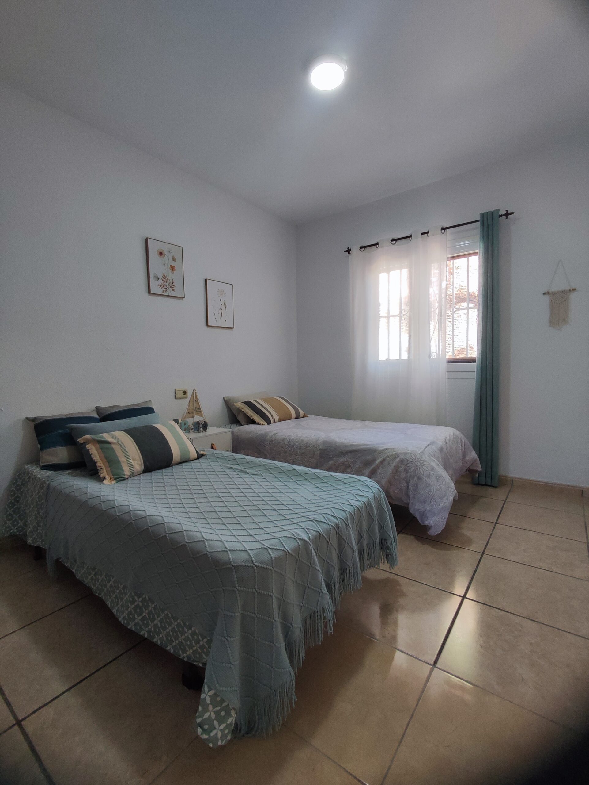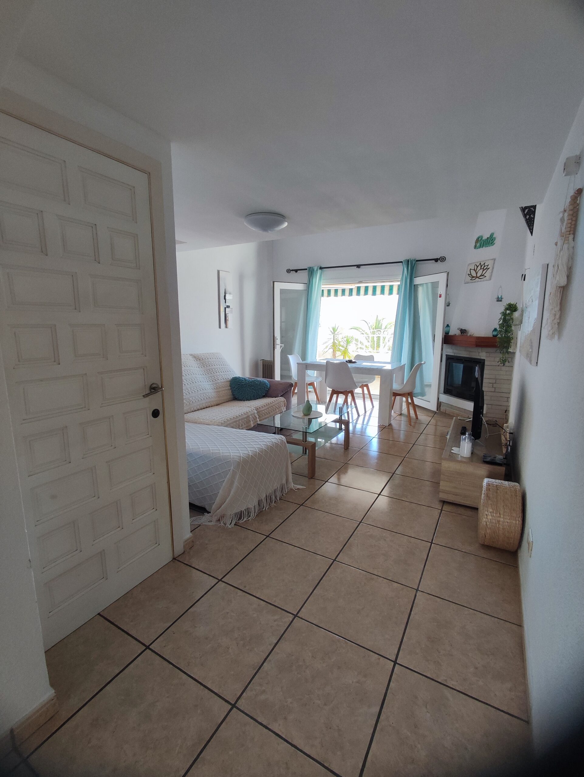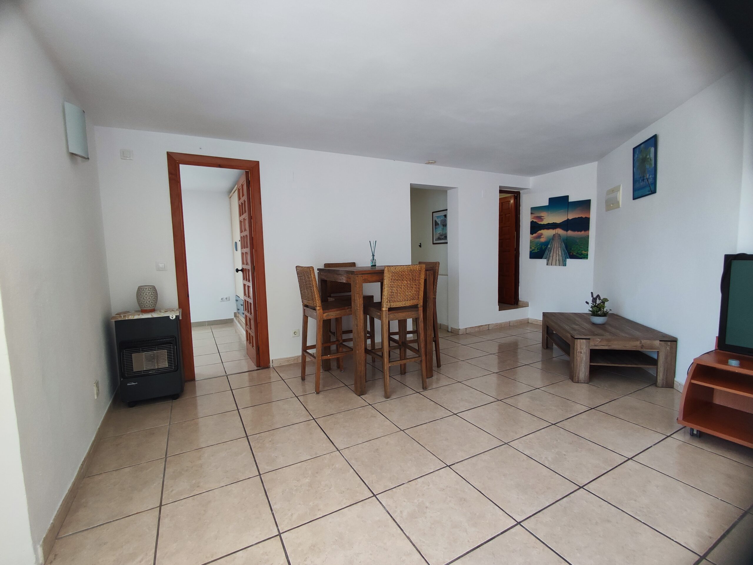 The main residence welcomes you with a spacious north-facing terrace framed by palm trees – perfect for relaxing in a green setting. Inside, the bright living room features high ceilings and a cozy fireplace, creating a warm and airy atmosphere. The layout includes two bedrooms, a bathroom, a guest toilet, and a versatile upper floor that can serve as an office or additional bedroom. From here, step onto a private balcony and enjoy beautiful open views. There is also a smaller room ideal as storage or an extra sleeping space.