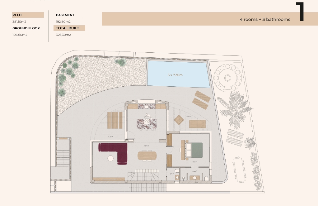 Total built size 345m2. Ground floor 106m2, basement 211m2